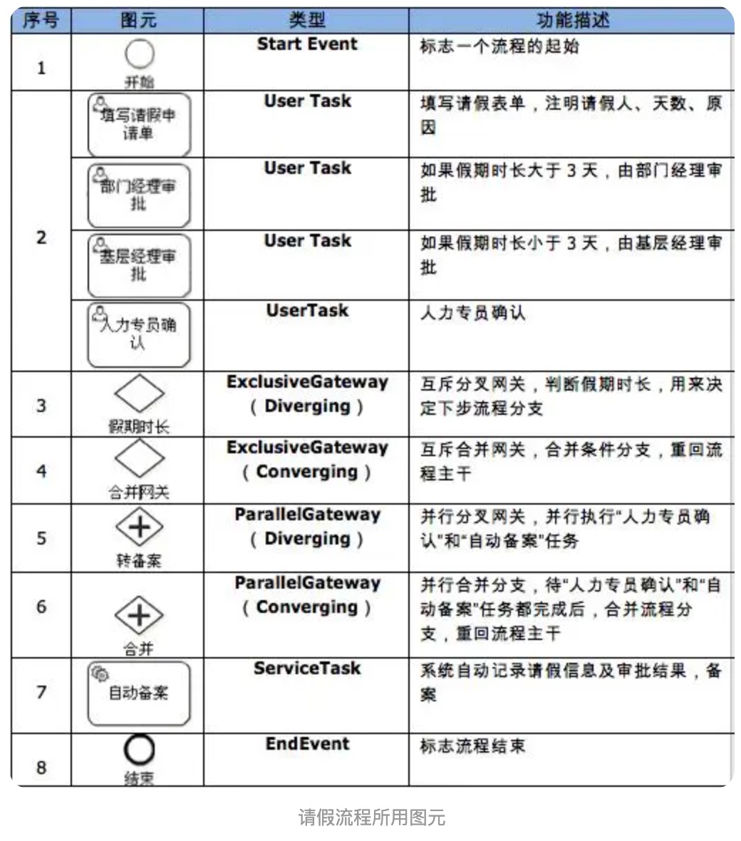BPMN2.0为所有业务元素定义了标准的符号,不同的符号代表不同的含义,以OA应用中请假流程为例,使用标准的BPMN2.0图元定义示意如图: